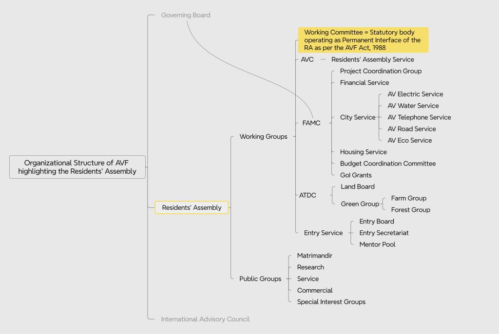 - The Working Committee serves as the permanent interface of the RA as envisaged under Section 20 of the AVF Act, 1988. Its members are chosen by the RA from among its residents, and its role is to assist both the RA and the GB. Since 2022 Auroville has been operating with two parallel Working Committees; one elected by the RA (known as RA WCom) in accordance with the Act, and another appointed by the GB in contradiction to the Act.